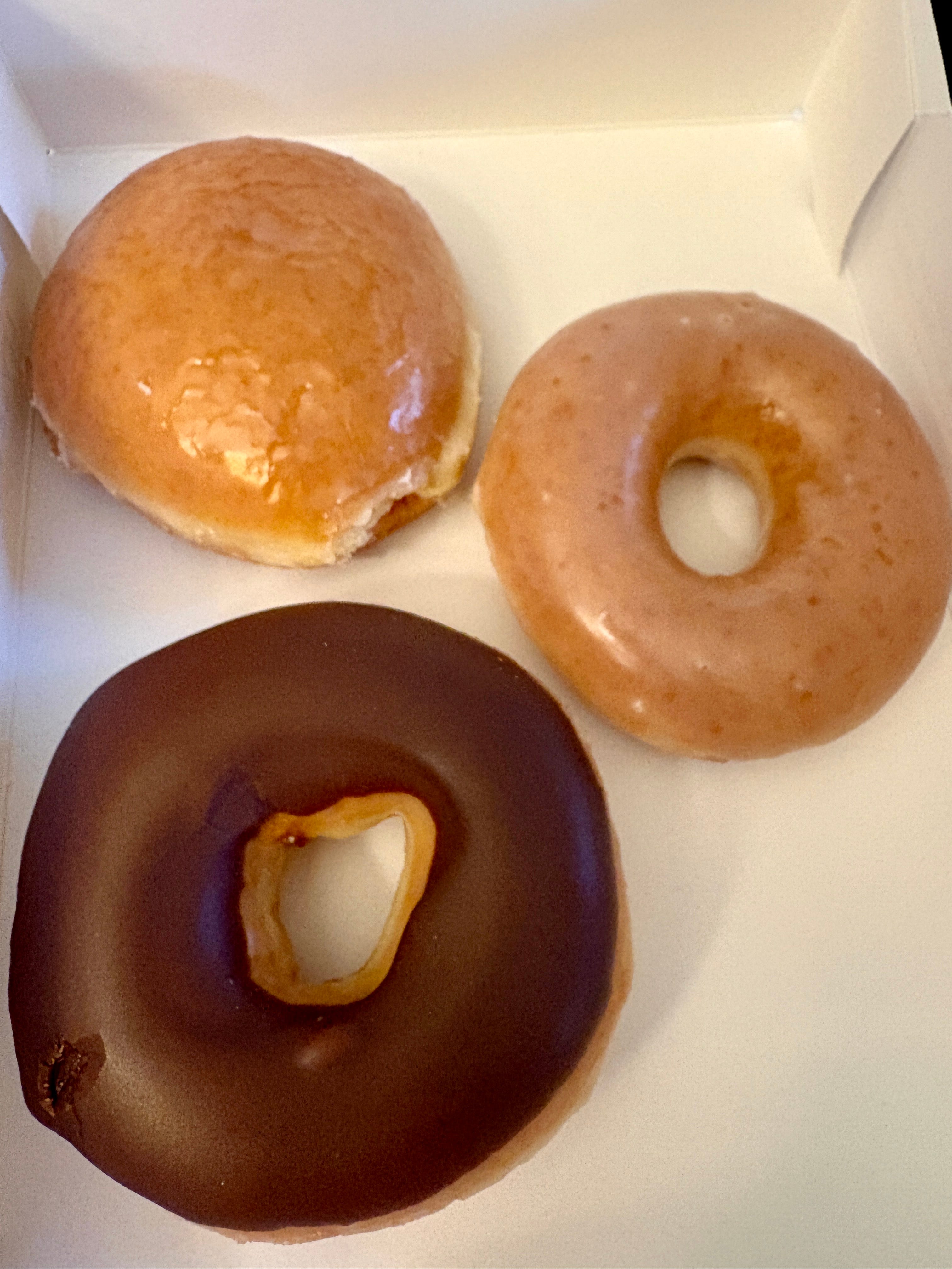 In the end I got three: the original glazed, chocolate ice custard filled, and glazed raspberry filled. They were placed in a box for half a dozen doughnuts and I carefully carried it home on the bus.