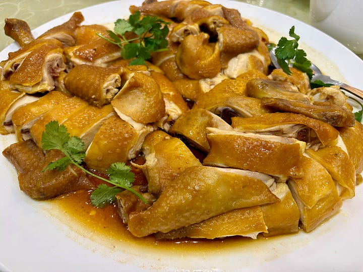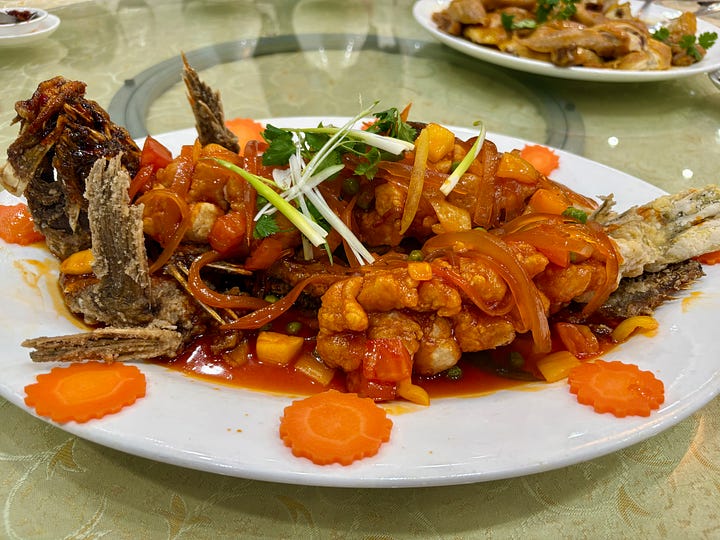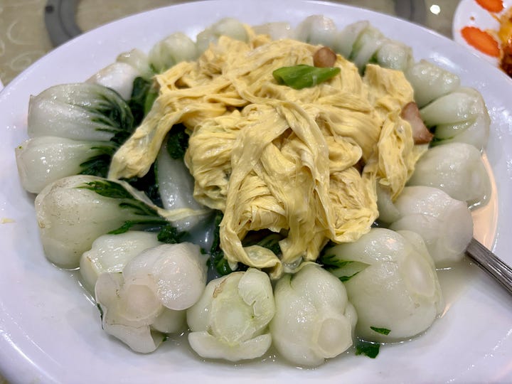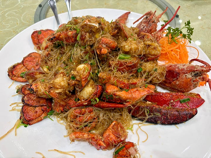 On the menu were dishes like lobster stir-fried with mung bean vermicelli, soy sauce chicken, sweet and sour deep-fried fish, bok choy with yuba, or tofu skin, and fried rice. We didn’t have tong yuen, but baked sago pudding with red bean paste.
