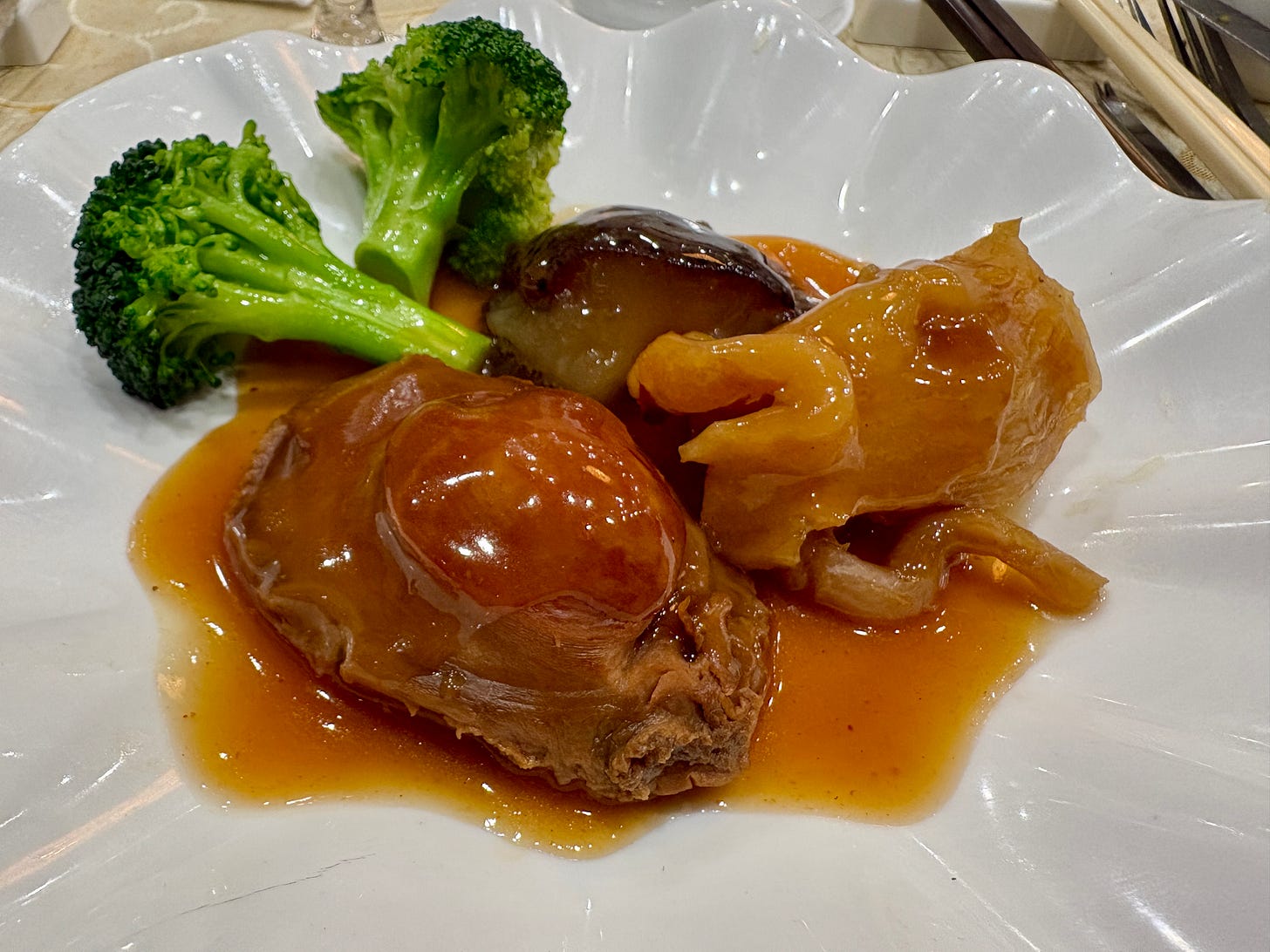 This particular soup was delicious, the broth was clear and hardly oily; we ate the abalone, sea cucumber and fish maw separately with abalone sauce.