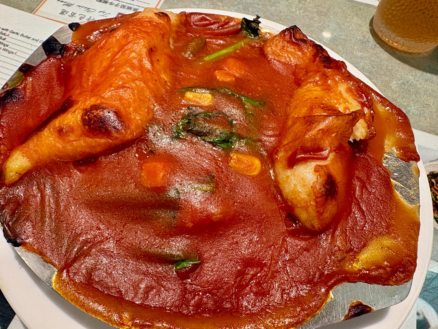 I ordered the baked fish fillet with tomato sauce, a stainless steel shallow round pan filled with rice mixed with bits of scrambled egg, a few spinach leaves and two small fish fillets that are smothered in a kind of Campbell Soup-flavoured tomato sauce and baked.