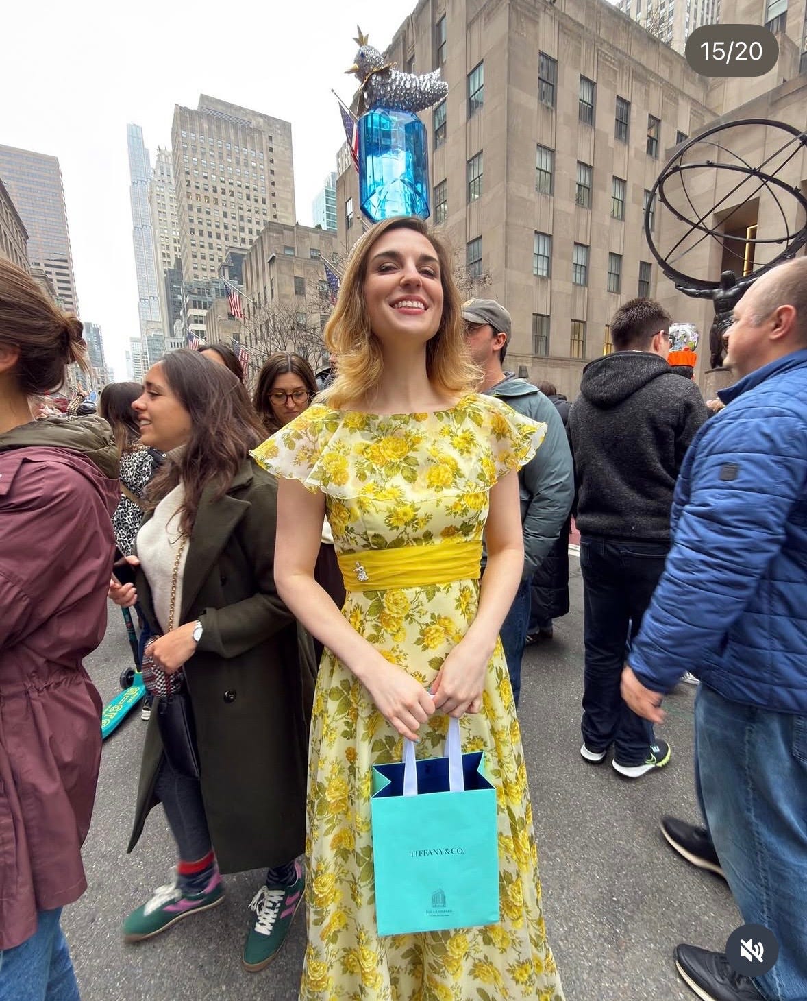 She is Emily Hupp, a jewellery box historian who explained that Schlumberger made the brooch for socialite Bunny Mellon, which is why she had a small bunny pin on her dress; she wore a yellow rose dress because Mellon was a gardener. So what better way to pay tribute to New York than with this bejewelled creation on her head?