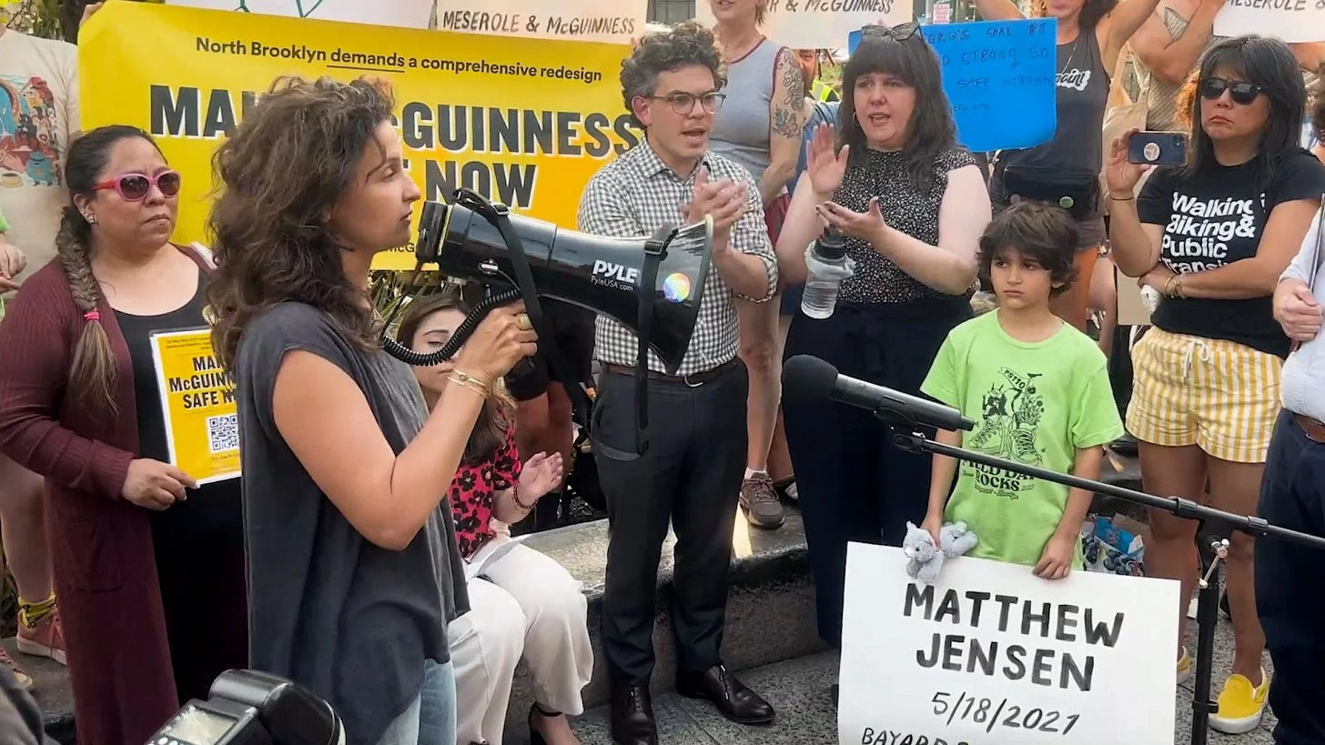 It opens with the death of a beloved elementary school teacher who was killed in a hit-and-run accident at Greenpoint and the residents in the area as well as grassroots activists mourn his death, and also call for the street to be designed safer for pedestrians and cyclists.