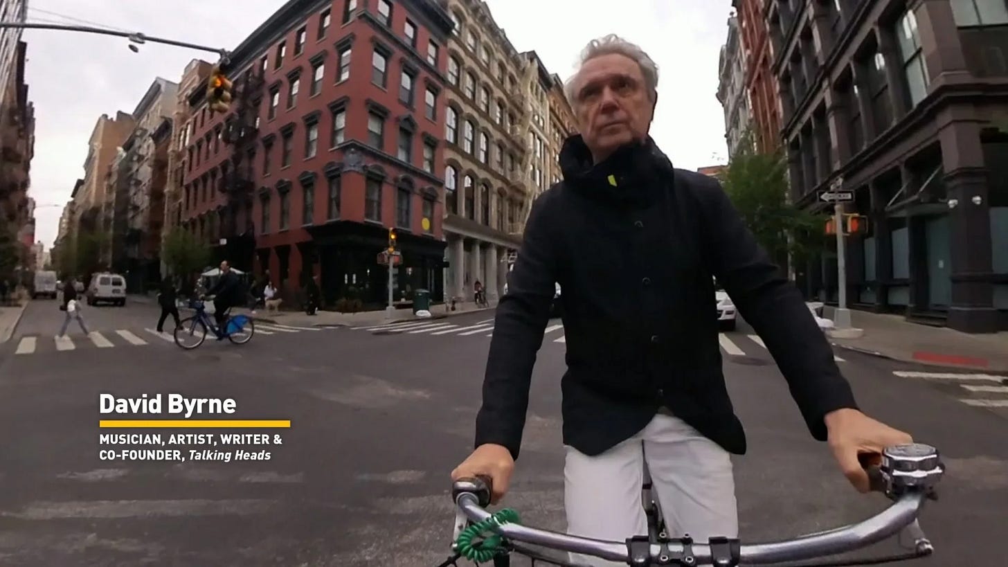 Numerous activists and pro-cycling people appear in Changing Lanes, most notably musician David Byrne, who is filmed riding his bike and explaining how it helps him get around the city and meet people, something he continues to do while on tour.