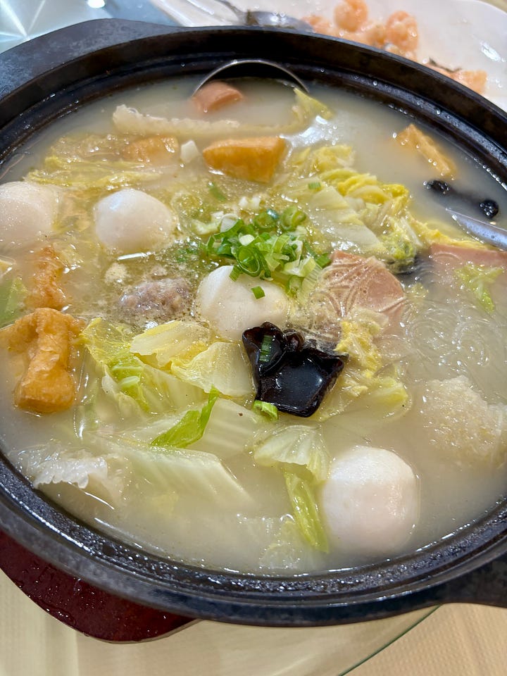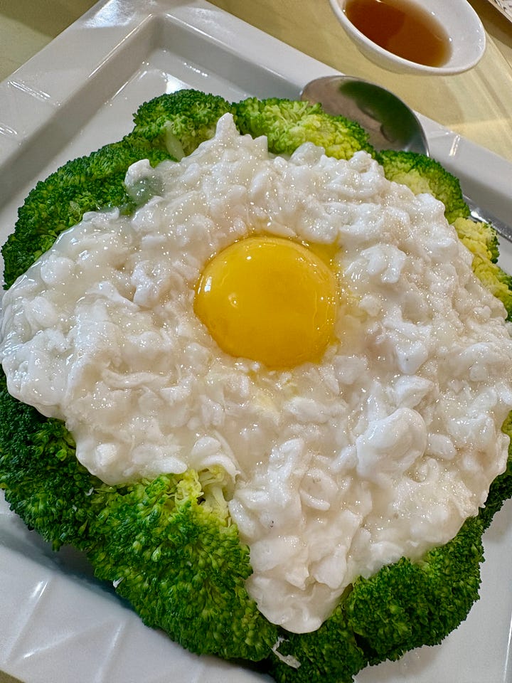However, we had a bit of a reprieve from the saltiness with a hot pot filled with napa cabbage, mung bean noodles, fish balls, ham, and pig skin in a soup. We also ordered broccoli stir-fried with egg white and a raw yolk in the middle. None of us wanted to try the yolk and ate around it.