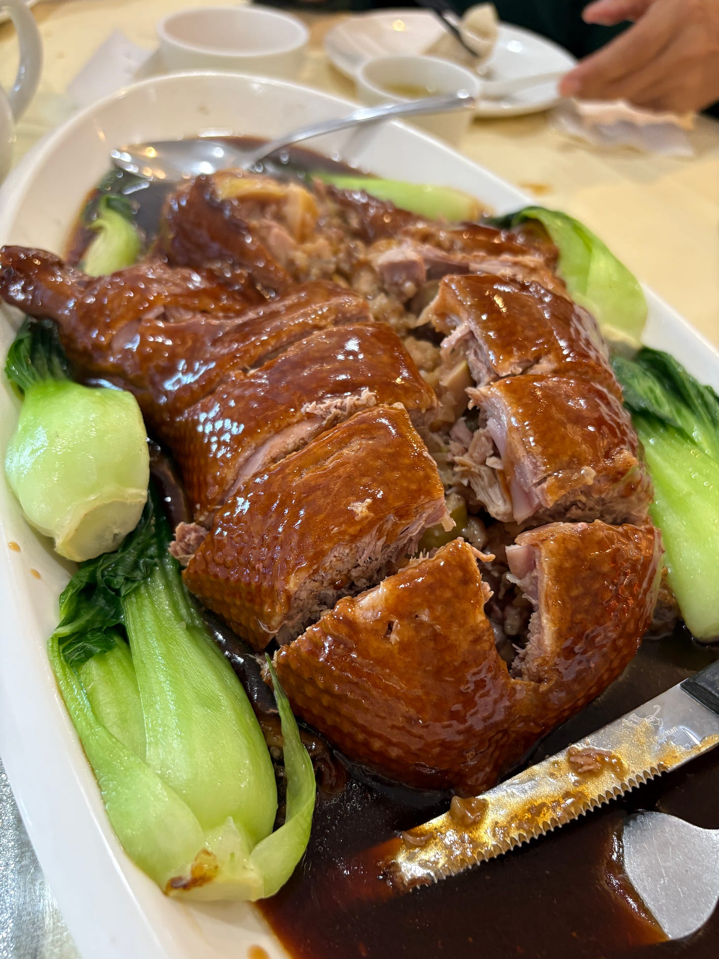 Next came our pre-ordered eight treasure duck and it arrived with quite the procedure. The waitress used a knife to slice it down the middle and then along the sides to make about 10 pieces.