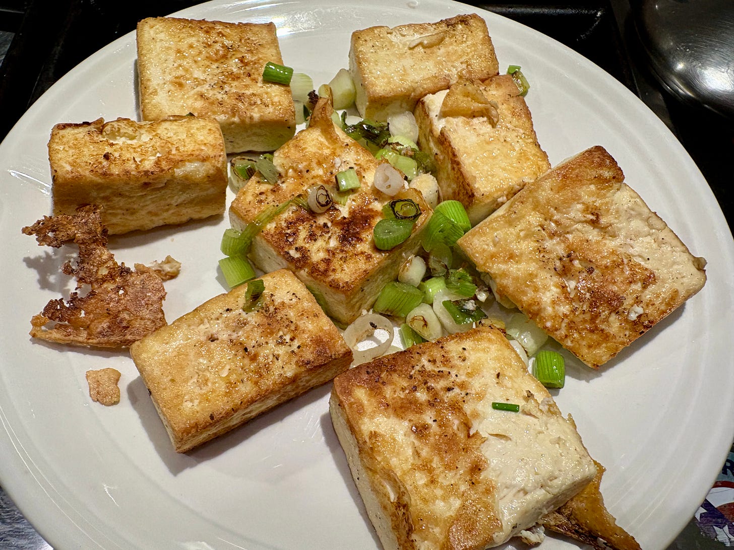 A dish we have on rotation for dinner is pan-fried tofu. I'm trying to get better at making it crispier, though I haven't resorted to using a mixture of potato flour and cornstarch yet.