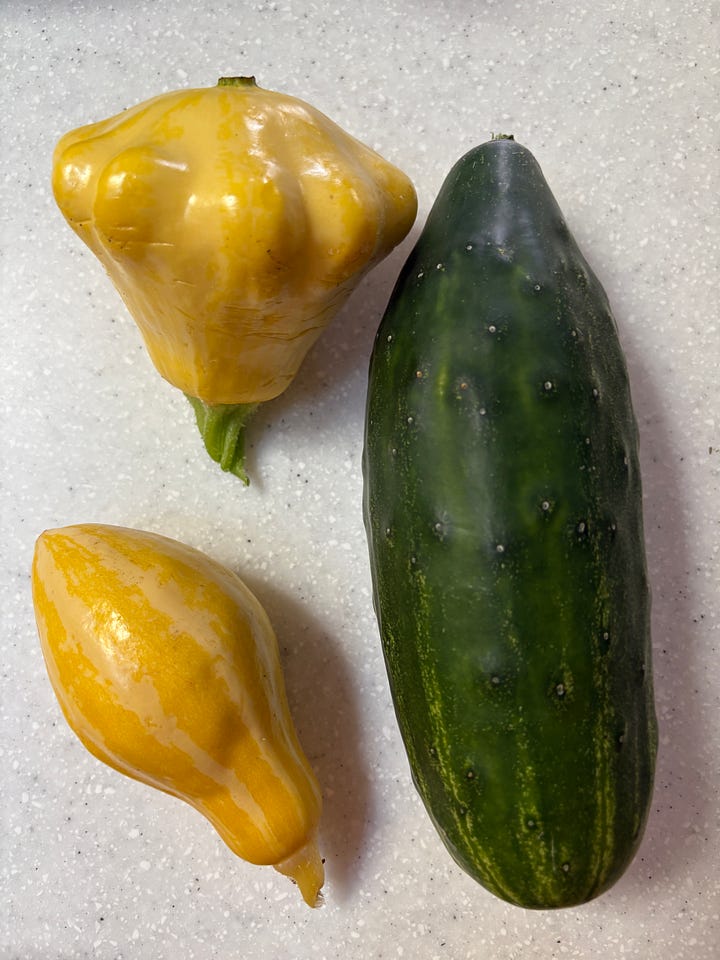 One is saucer-shaped called pattypan squash or scallop squash because of its frilly edge. The other is a mini striped acorn squash. I picked up another cucumber that was relatively small.