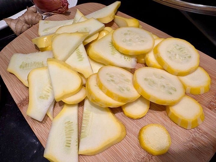 I first stir fried shallots, garlic and ginger in cooking oil, and then added the two squash, and some water, and let them steam for a bit.