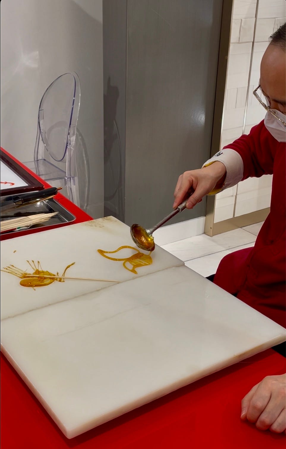 Yesterday was the fourth day of the Lunar New Year. I was at Canadian luxury retailer Holt Renfrew in downtown Vancouver, and saw a man in a Chinese jacket making sugar painting (糖画).